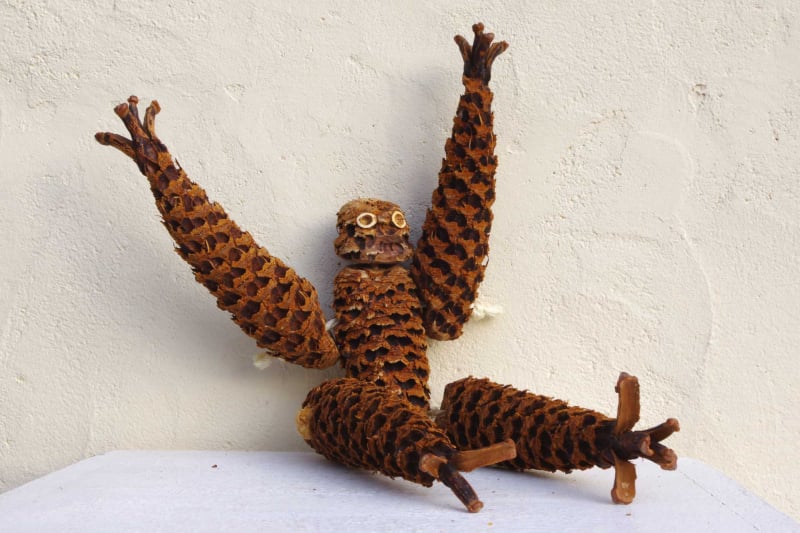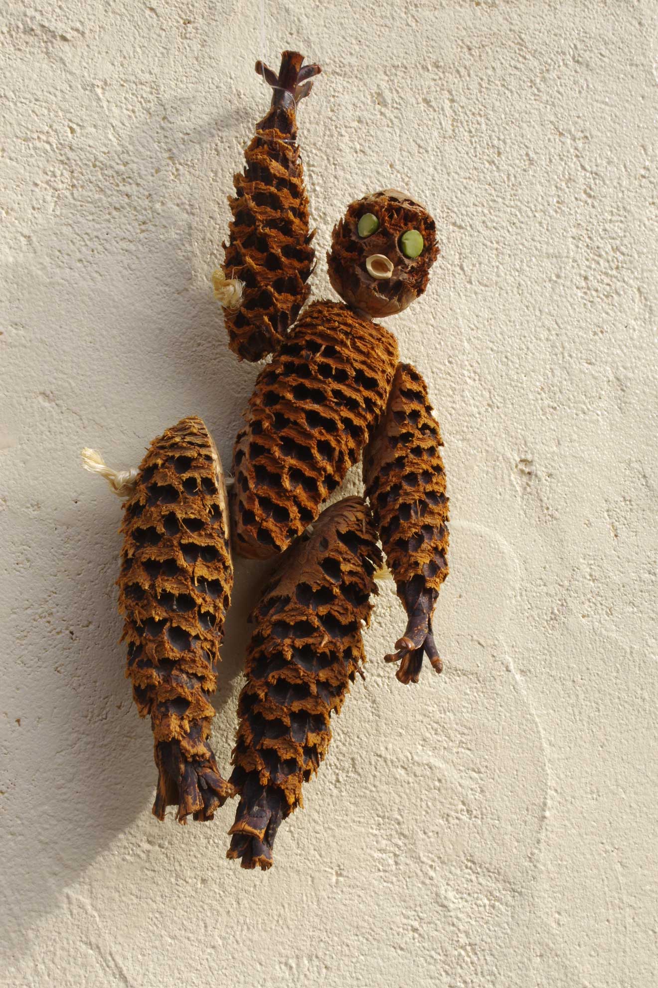 C’est avec 6 rafles de pommes de pin maritime, c’est-à-dire l’axe central de 6 cônes de pin, 2 bouts de ficelle et petit bout de bois que ce gorille est fabriqué.